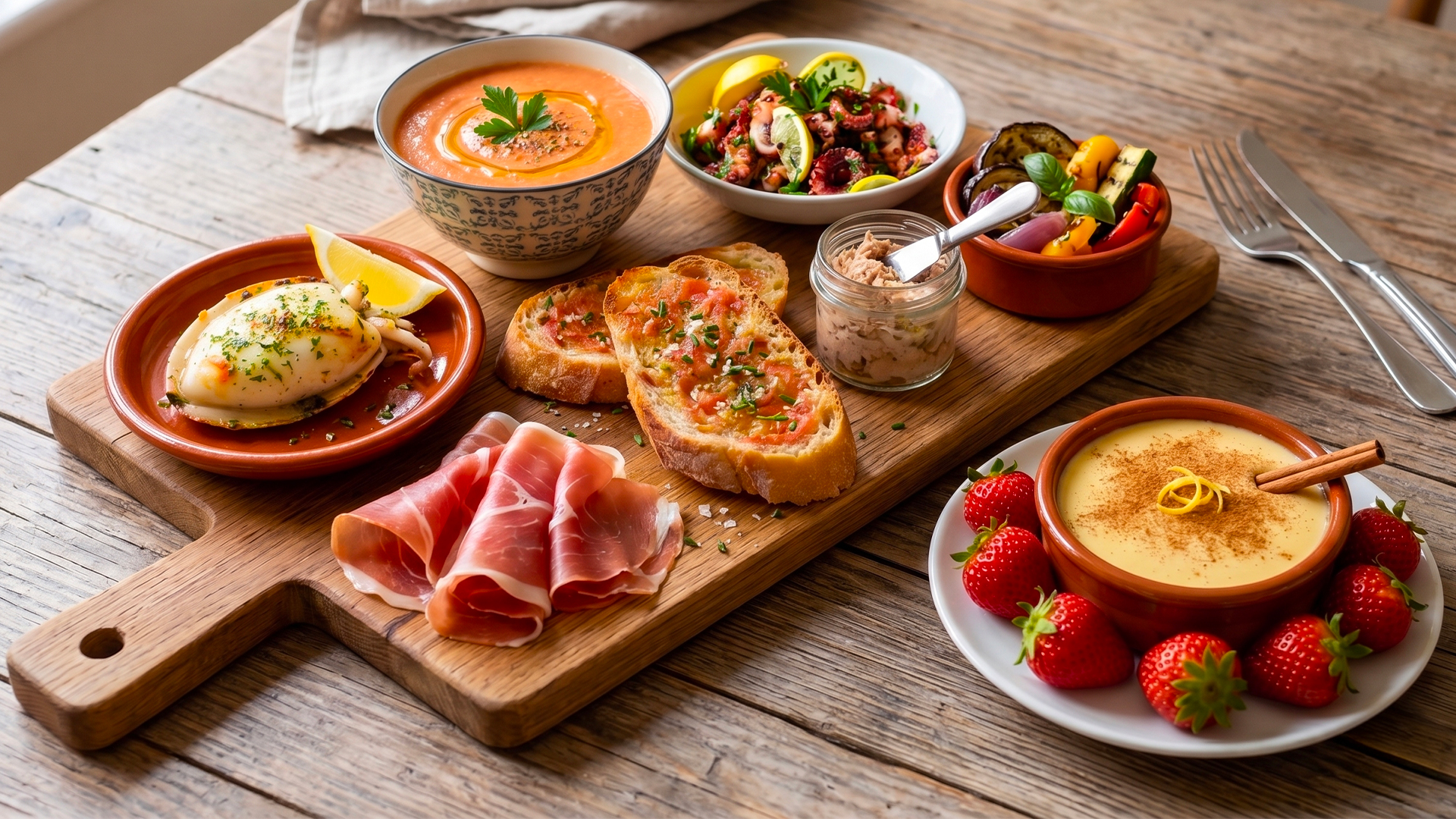 Plat : Assiette de spécialités espagnoles (Gaspacho maison, salade de poulpe*, seiche à la Plancha, pan con tomate, jambon Serrano, rillettes de poisson, légumes grillés marinés....)