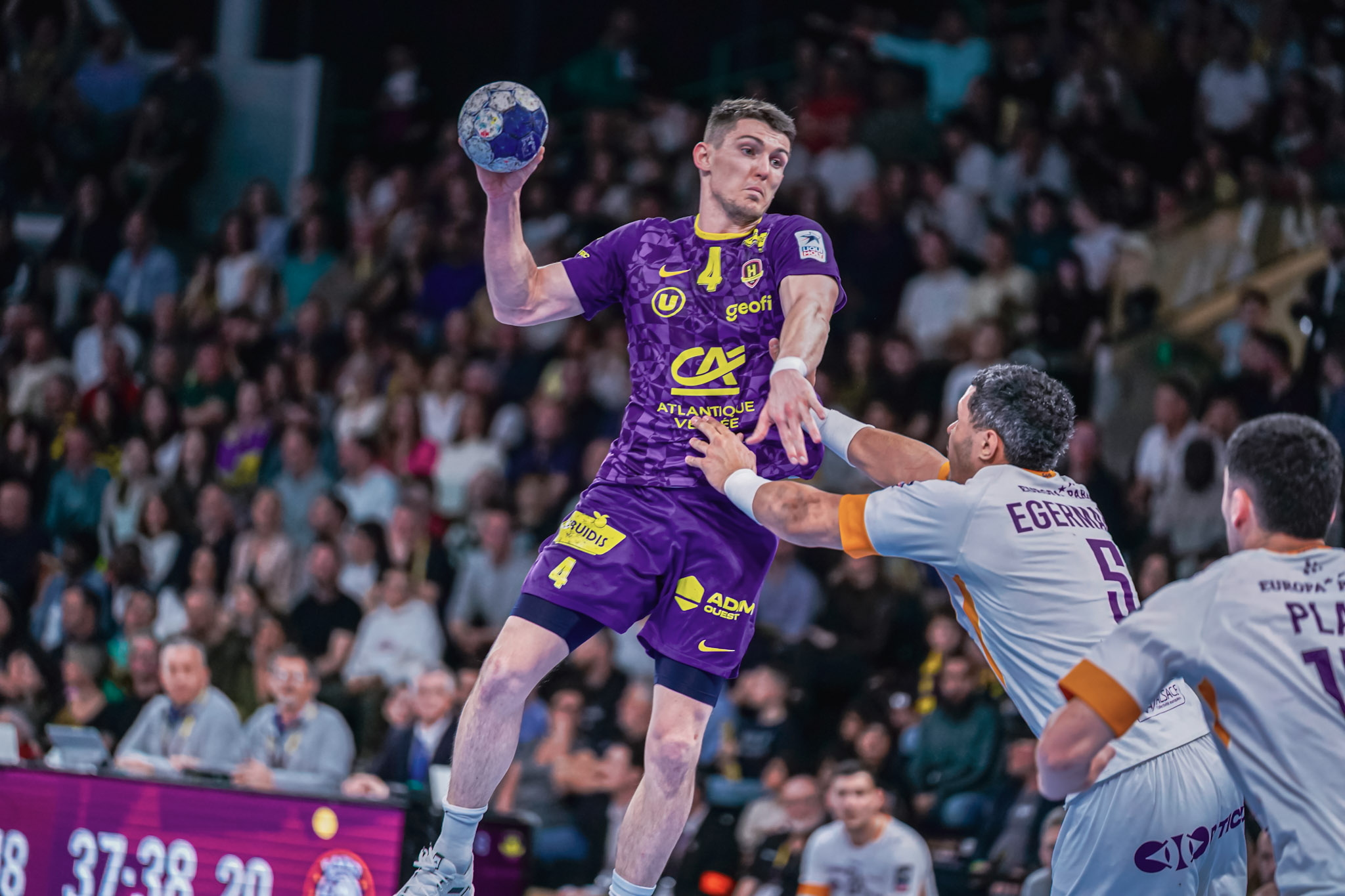 Les Violets prenaient à leur tour 2 minutes d’exclusion, et les adversaires en profitaient (20' 8-11). L’écart restait autour de 3 à 4 buts en faveur des Alsaciens. Ivan Pesic sauvait le ballon du -5 (26' 10-14). La fin de première période était plus brouillonne, et les arbitres avaient de nouveau recours à la vidéo. À la mi-temps, le « H » était mené 13-15, malgré un ultime but de Shuichi Yoshida après une récupération de balle.