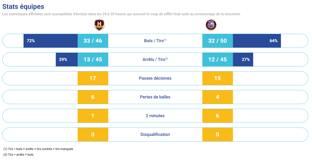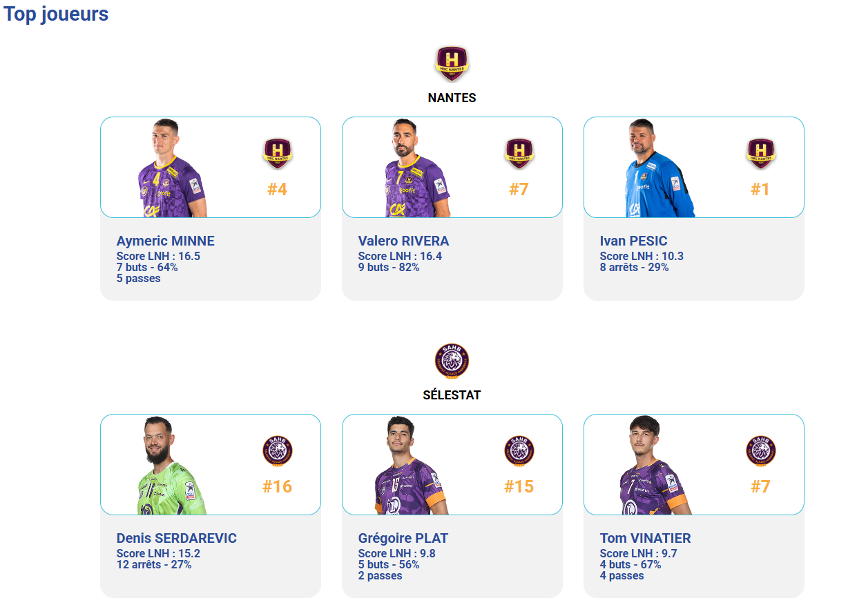 HBC Nantes : Ivan PESIC (8/28), Ignacio BIOSCA (5/17), Romain LAGARDE (0/1), Thibaud BRIET (3/5), Aymeric MINNE (7/11), Shuichi YOSHIDA (1/1), Valero RIVERA (9/11), O'Brian NYATEU (1/1), Théo AVELANGE-DEMOUGE (3/3), Rok OVNICEK (1/2), Nicolas TOURNAT (4/4), Julien BOS (2/4), Matej GABER (1/1), Ayoub ABDI (1/2), Kauldi ODRIOZOLA, Yoni PEYRABOUT.